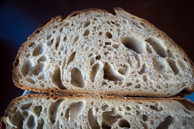 All the loaves had nice oven spring and looked pretty much like my other bakes. Now, here’s the surprise: The large loaves had huge blisters, and an overall shine to the crust, while the smaller loaves did not. OK, maybe the lack of shine on the small loaves was masked by the flour coating the brotforms, but why the lack of large blisters?