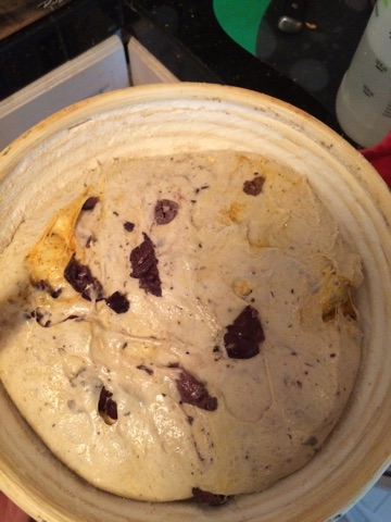 For flavor and color, I added kalamata olives for purple. To help the bread rise to the occasion like the Warriors didn't do, I figured they'd need the the Curry 3-Point Hot Streak (Curry is their best player who lives/dies by 3-pointers), which contained curry powder, more nutritional yeast, more old bay, horseradish, and 3 shakes each of 3 kinds of hot sauce (Franks, Tabasco, Sriracha). It created a golden, strong-smelling mixture that I let sit overnight in the fridge and added during the stretch and folds so it would produce a literal hot streak throughout the bread.