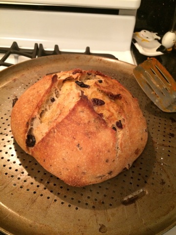 Starter, olives, 1 tsp salt, and hot streak were incorporated Sunday morning. I fidgeted a little with adding more flour to help with the wet starter and olives, then spraying more water as I thought the dough wasn't wet enough. That extra handling made me anticipate a tight crumb, with possible cake-like aspects from the semolina and corn flour. I baked in my preheated combo dutch oven for 20 mins at 450 and 20 mins at 350 using kosher salt on the bottom as is my habit.
