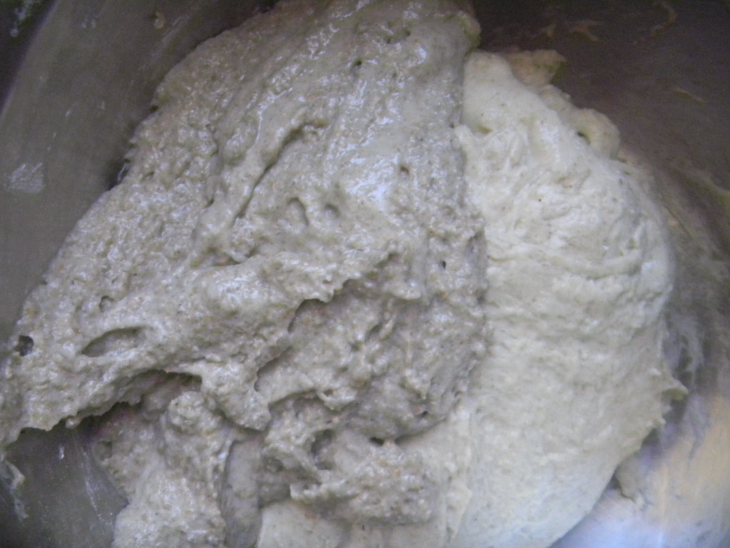So with those add ins, it would make sense that the dark greyish dough is all rye or part rye and whole grain of some kind made from your 66% rye starter that you keep in the fridge. These grains were probably sprouted, dried and milled over a few days. They are also likely to constitute at least 40% of your total dough since you like whole grains in your bread due to health reasons.