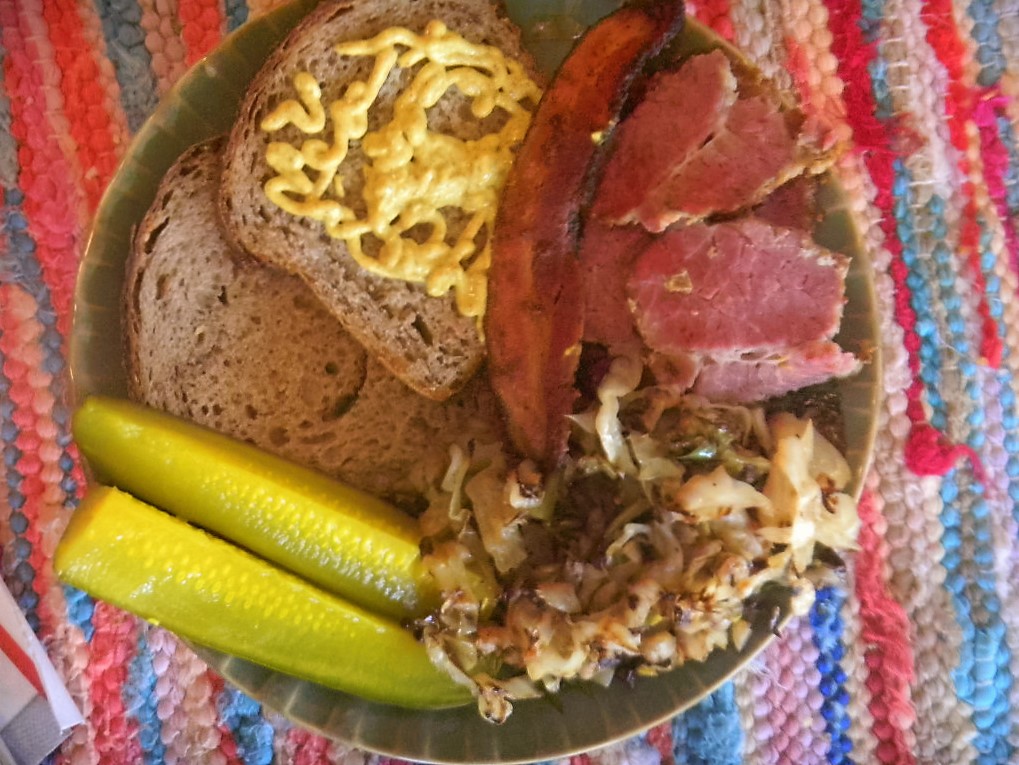 mustard. This was a pretty tasty sandwich for sure but a lot of work if you make it all from scratch. At least we didn't grow the cabbage and the grain:-) Hope your 4th was as nice as ours and that your porridge bread turns out OK. Lucy sends her best to here furry friends and