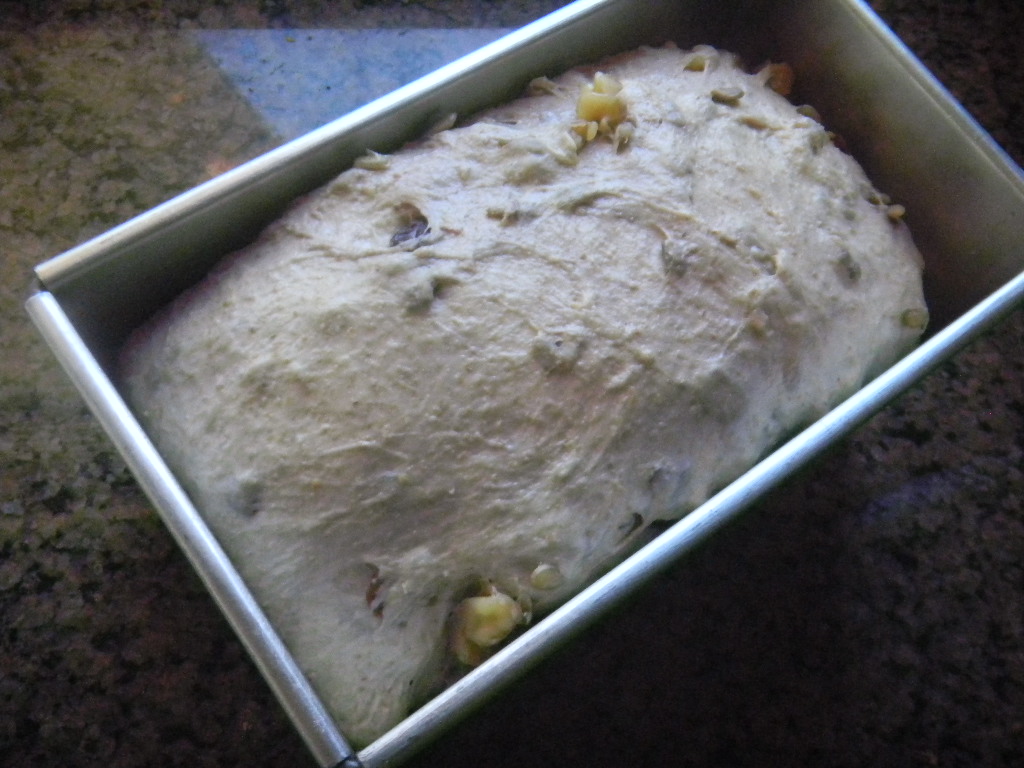 is one of my favorite combinations, too!  I've been thinking of making a bread with these two ingredients but other things always get in the way.  With sunflower seeds, your bread must be super delicious!  I like the shape of your bread :-) and glad to see you put the tin to good use.  Looking forward to seeing the crumb...