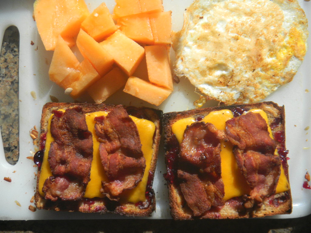 The crumb was not as open as a boule would be, perhaps too much dough for the pan?  It wasn't dense though and made for a fine breakfast toasted with butter jam, sharp Cheddar cheese bacon and egg sandwich with a side of cantaloupe.  This bread was very tasty with the sunflower seeds and walnuts really coming though and bit if sweet but tart cranberry in the background.  Pretty yummy all in all.