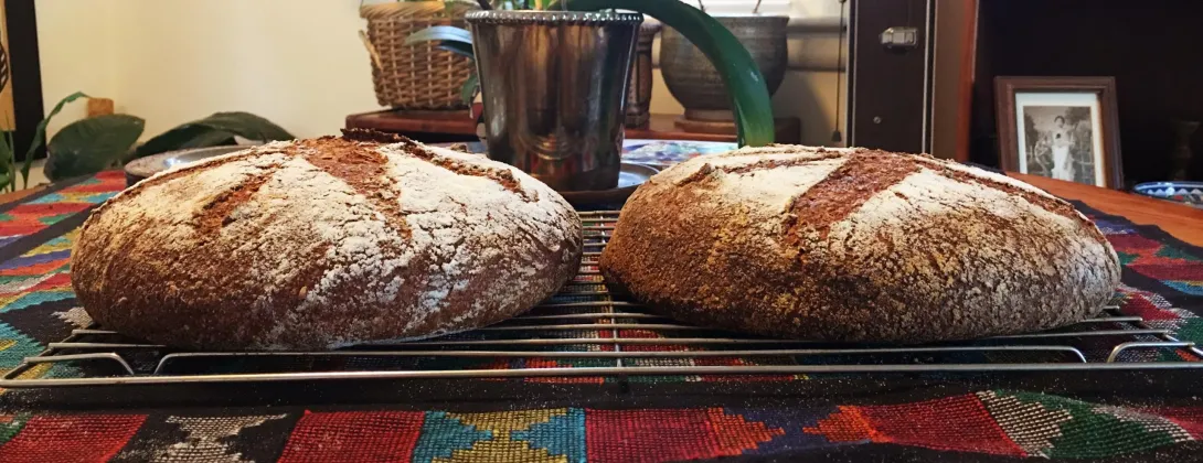 Ever since the bottom of my cloche broke I've been baking dual loaves side by side, one in a combo cooker and the other directly on my baking stone covered (initially) with a cloche.  The loaf baked in the CC consistently comes out better looking than the other one.  In the picture the loaf on the left was cooked in the CC.  In both cases I got a bit of spread, which isn't surprising given the 83% hydration.  But while the loaf on the left is nicely rounded, that on the right has a bit of a lip or brim (look closely at the left edge of the loaf on the right) and one side rose more than the other.  Actually this loaf looks better than my last few loaves cooked this way.  Any idea what is going on here?  Why are the loaves baked on the stone under the cloche getting a bit misshapped?  The loaves are otherwise identical and scaled at the same weight.  This bread is essentially Della Fattoria's Pane Integrale with rye sourdough substituted for wheat and cracked rye used in place of cracked wheat (this is 60% whole wheat, 20% bread flour - I use Anson's white, 10% cracked rye, and 10% pumpernickel; the leaven is 14% and the formula includes 7% honey and 2% salt).  Advice would be appreciated.  Thanks in advance.