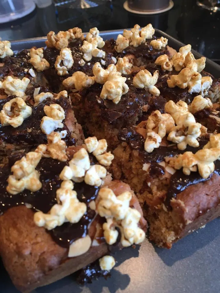 Peanut Butter and Almond Blondies, filled with crunchy almonds and topped with a Sticky Peanut Toffee Glaze, toasted flaked almonds and ProperCorn's Almond and Peanut popcorn.