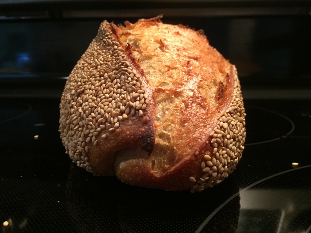 The simple secret to coating these devils - a wet paper towel is laid down on the counter and the entire top of the loaf is rolled on it to get the moisture to adhere. The loaf is then immediately rolled on a pan filled with sesame seeds. That's it, now the cat's out of the bag (again). BTW I learned that from one of David Snyder's posts.