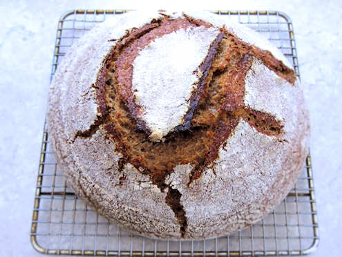 My attempt at Poilâne-style bread, here's the recipe - Breadtopia's seemed reasonably authentic and reliable. My starter was rye and perhaps a bit more runny than it should have been but the dough proved nicely, sprang beautifully in the oven and cracked handsomely on top.