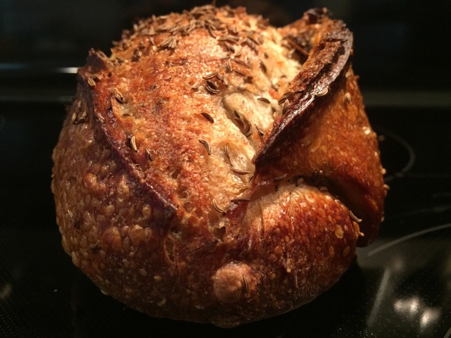 I had such a good bake with my one previous turn at David's SFBI Pain au Levain (my way!) , a mostly all AP flour dough, that I knew I'd be returning to the scene of the crime soon enough.  Again using my 75% hydration levain and adding water to make up for the difference vs. a liquid levain, I also decided to add caraway seeds to the dough.  A good slather of cornstarch glaze before and after the bake.  More caraway seeds were sprinkled on top, post-bake, between two final glazes.