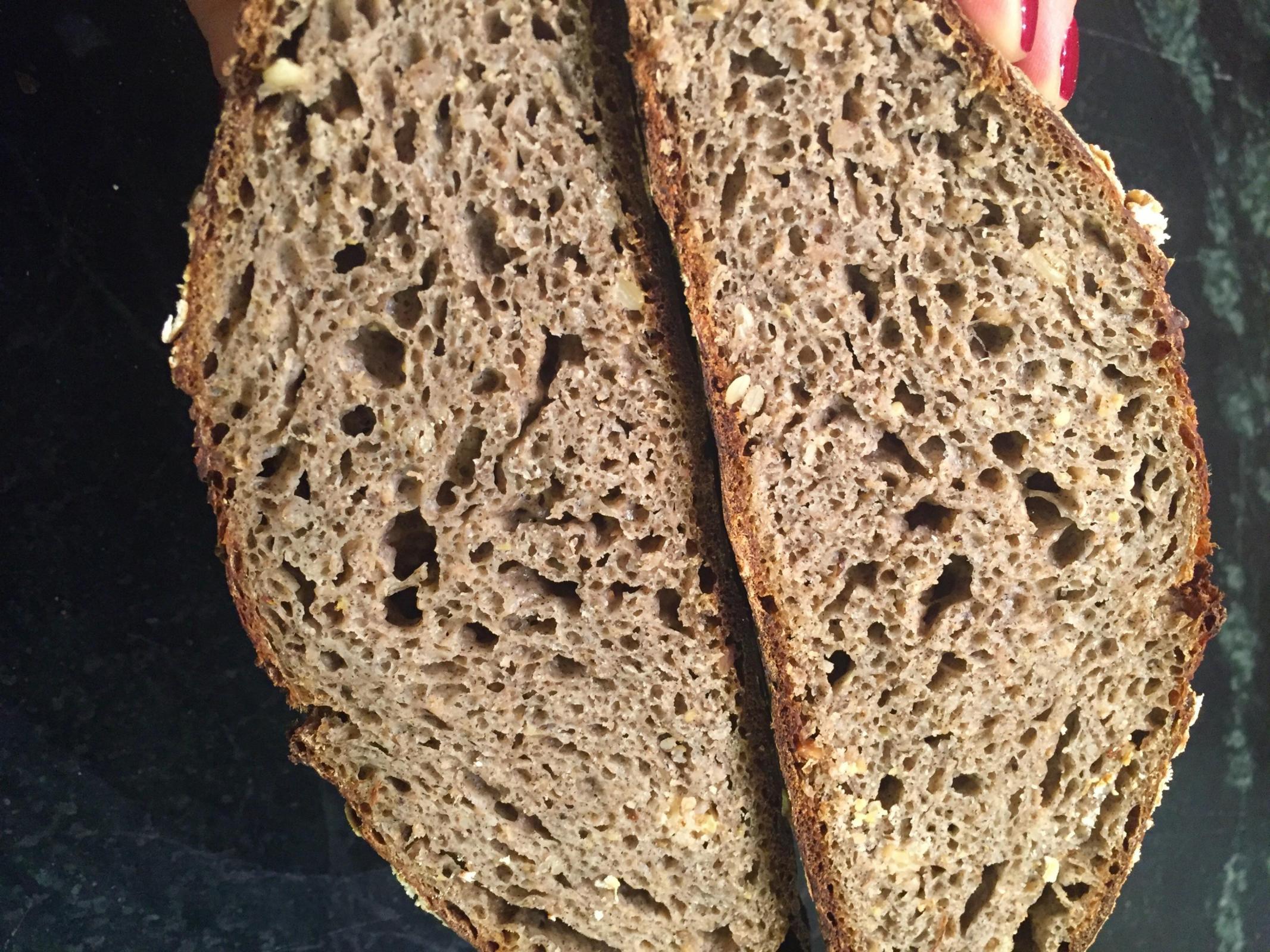 Next time, I will toast my seeds, but for now, I am groovin' on my Treehugger Special! The porridge is not identifiable on its own, but definitely lends to a creaminess to the crumb. The crumb is light and delicate, open but not gaping, with seeds suspended throughout. This makes incredibly flavorsome toast. I might like some chopped toasted nuts in this as well. This could (will) be delicious sandwich bread too. I imagine a hunk of this would be truly satisfying next to a fall stew. Happy baking!