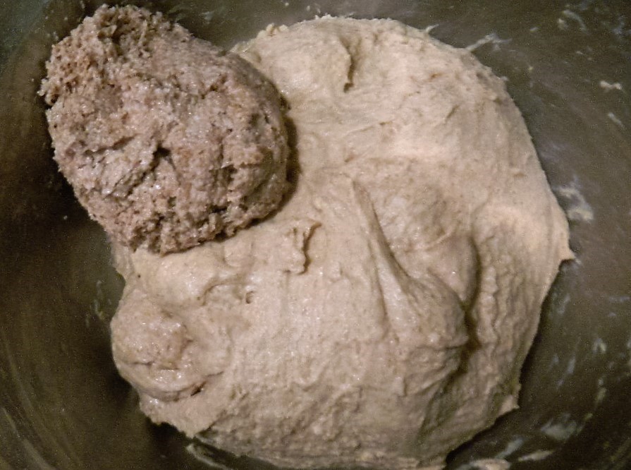 The levain was made from 10 g of our long fridge stored NMNF stiff rye starter. It as bit on the small side at 8.33% pre-fermented 18% extraction bran sifted from the fresh milled whole grains, but it is still in the low 100’s here and things move very fast when it comes to wee beasties working in levains and bread dough.