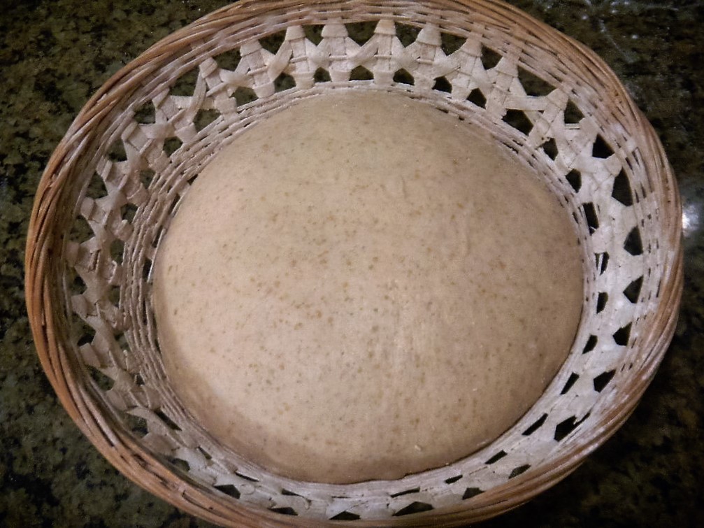 It did get a bit more structure as the slap and folds and stretch and folds went along but it was not quite right and still too wet for even one of these kind of breads.  Still, after 6 rounds 20 minutes apart, we let it rest for a half an hour before shaping it and plopping it into a rice floured basket