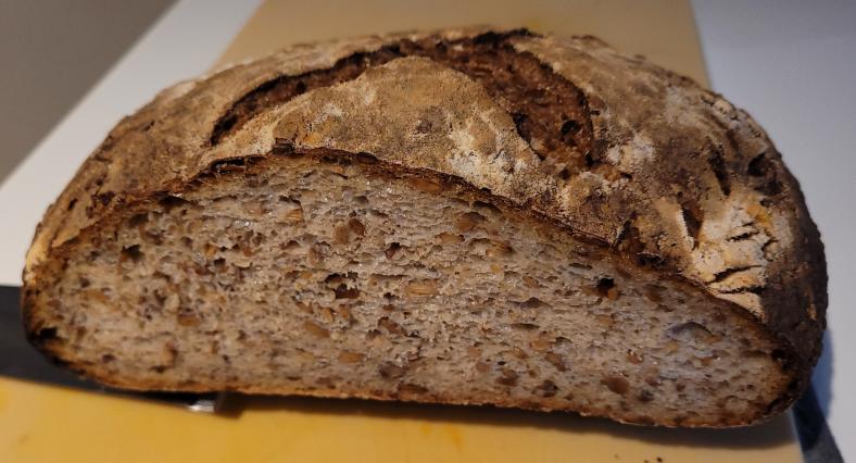 bred with seeds and nuts that came out great. This one has to be tasty for sure. Not quite as much mahogany color since no fruit sugars were in the mix but a very nice color none the less. This will make some fine toast that you can put butter and jam on!