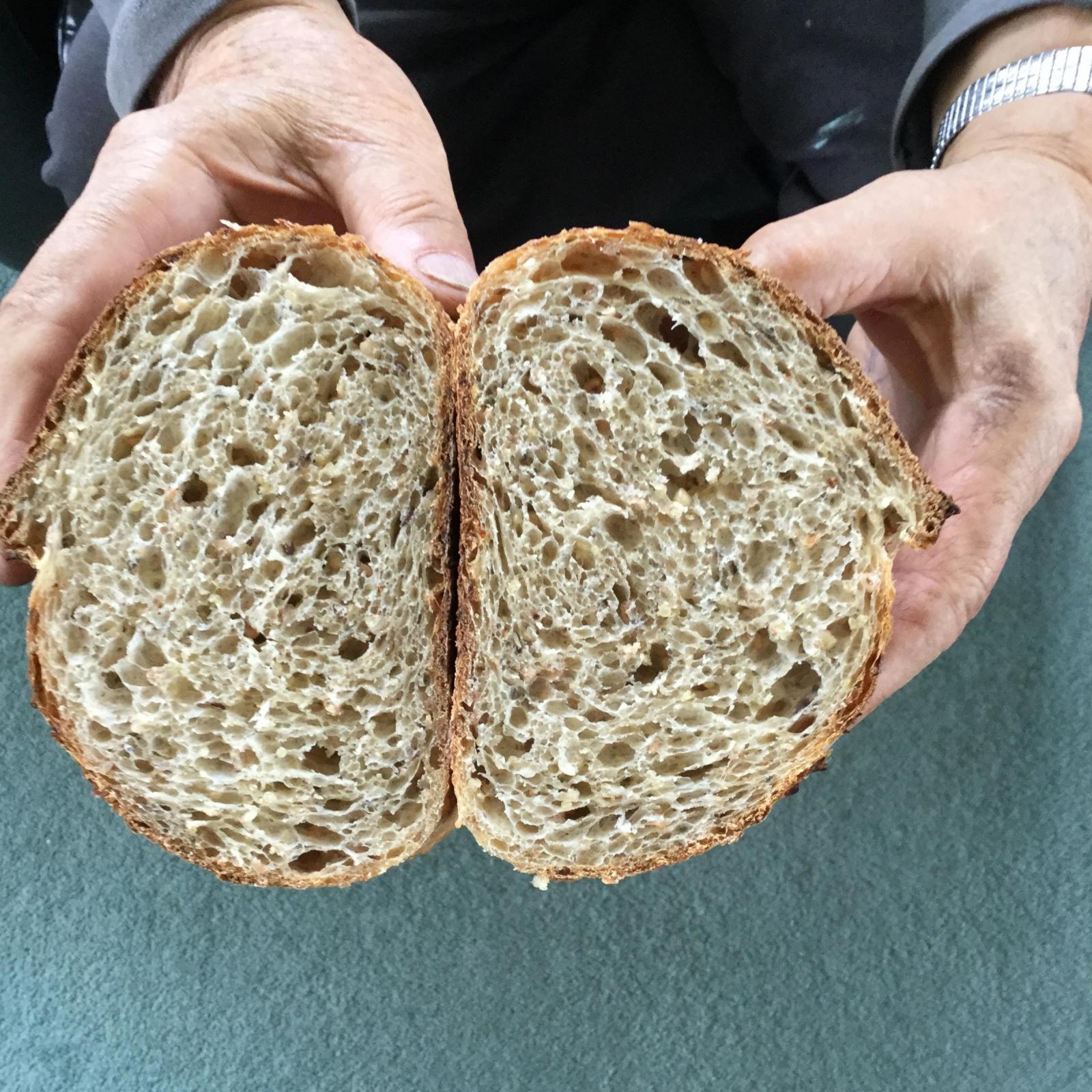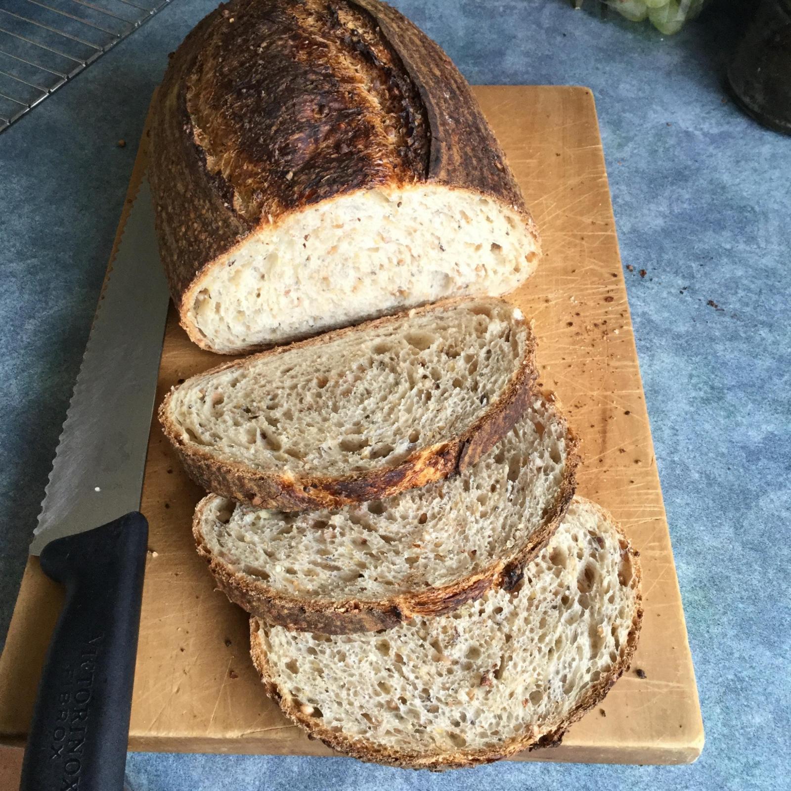 Built levain in one step just becore bedtime - 50 gm starter, 100 gm water, 100 gm higrade flour and left it overnight. made hot water soaker with grains and salt and left overnight. in the morning mixed higrade flour, whole wheat flour plus a little gluten with remaining water and a little honey to get a shaggy dough. It was drier than I usually make so after about 20 minutes of autolyse I added grain mix and levain on top and left a further 15 minutes before mixing by hand. 1 slap and fold and dough was very tight so the other 3 were stretch and fold only. Dough was pretty slow but by 6 pm had risen nicely and doubled. pre shaped aand left it while we had dinner, then final shape and into frige overnight. baked direct from fridge this morning in DO. Really happy with this, its always good but this time was a bit better than usual.