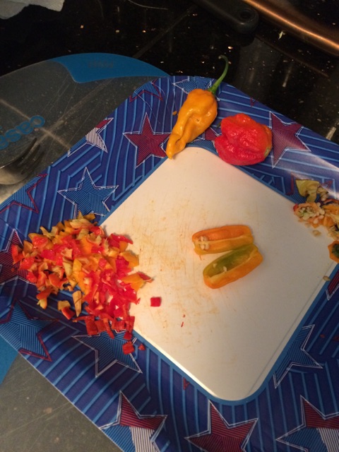 I'm no good at posting pics, but the basics are covered here. Ingredients, stretch and fold... The garden up the street at my friend's place has a patch of scary peppers that I was instructed to raid for bread add-ins. He and his uncle grow the devilish things, and I don't know what the yellow ones are. The reds are the Carolinas. Most of the time, I only visit the garden for bundles of fresh rosemary from two slightly different bushes.