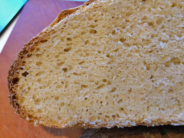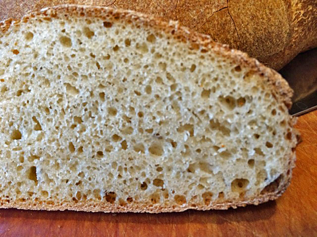 Consistent with over-proofing, the crust was rather pale and dull. The oven spring was modest with relatively little bloom. The crust was a bit tough, not crunchy nor chewy. The crumb was surprisingly even. The flavor was good sourdough white bread – a little bit sweet with lactic acid flavors predominating and just a bit of acetic acid tang. Not bad bread but certainly not what I wanted to produce.