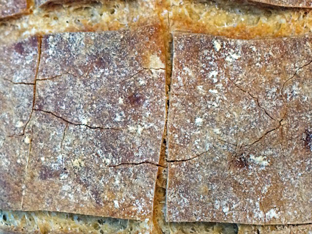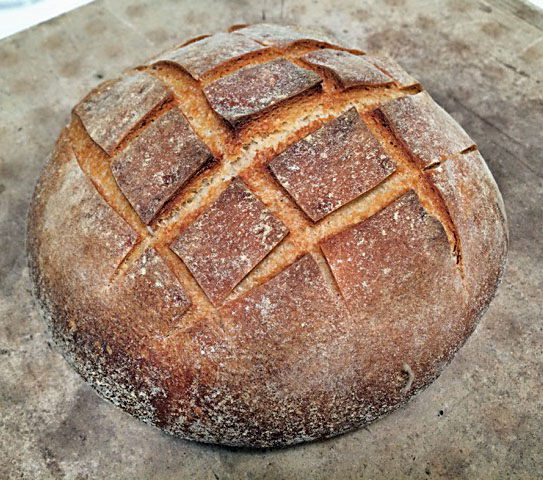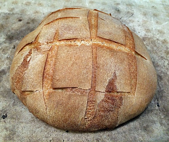 Bake on a baking stone with steam for the first 15 minutes at 420ºF for 40-50 minutes altogether. (Note: I prefer a bolder bake, so I actually baked at 460ºF for 35 minutes. Obviously, time and temperature would be adjusted according to how dark you wanted the crust, how heavy the loaf is and the shape of the loaf.)