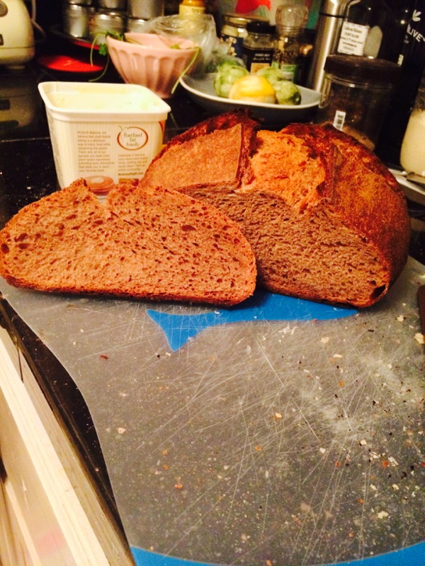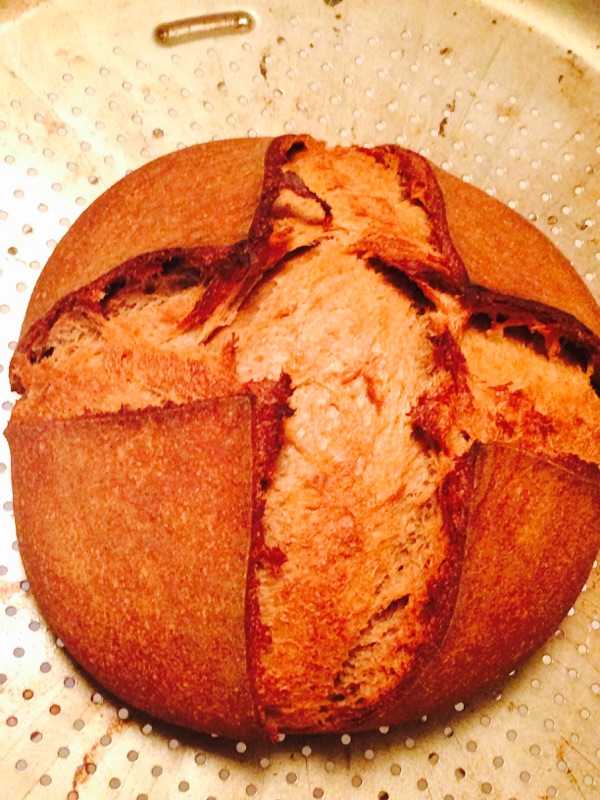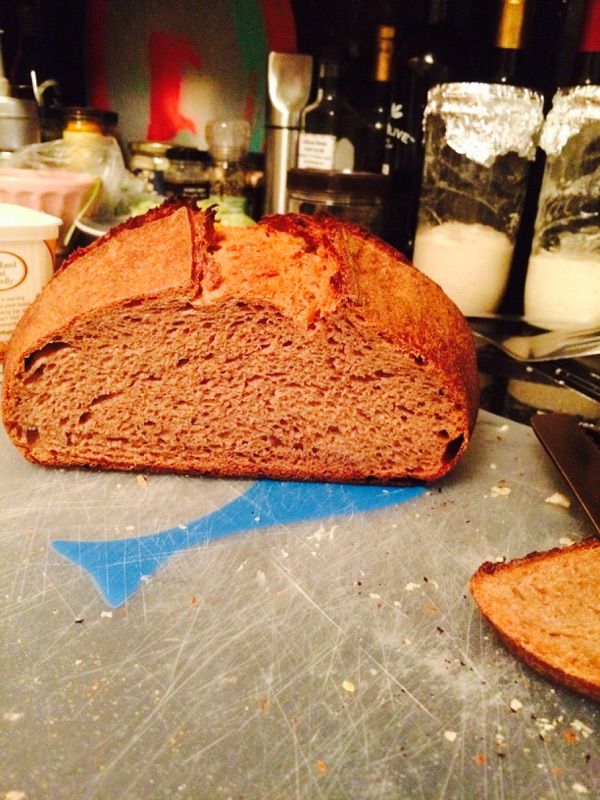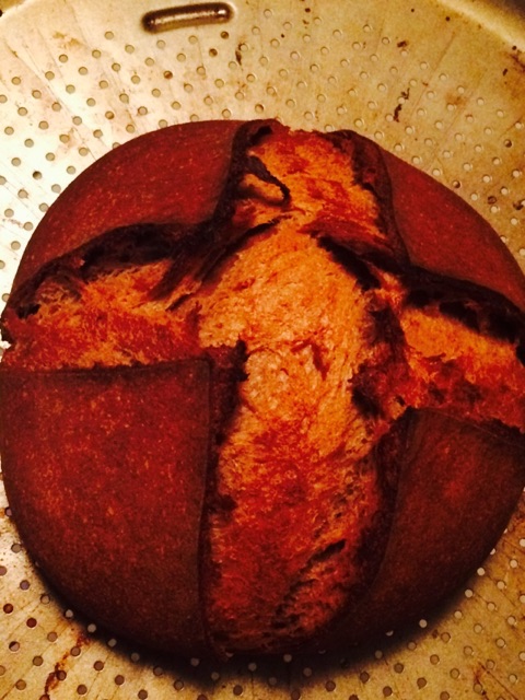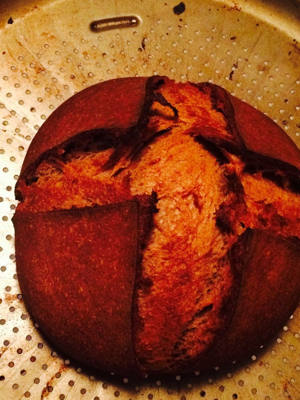 With two different camera settings, the color looks completely different, so I included both. The hotter temp than usual left the bottom a little blacker than I like, but it tasted good. With the rye and the oils from the Nutella, this had a soft crumb that you could compare to the Beefsteak brand rye breads sold in supermarkets. The taste reminded us both of the pumpernickel breads we had growing up but with a lighter, nutty taste. It's ever so slightly bitter and really tastes good.