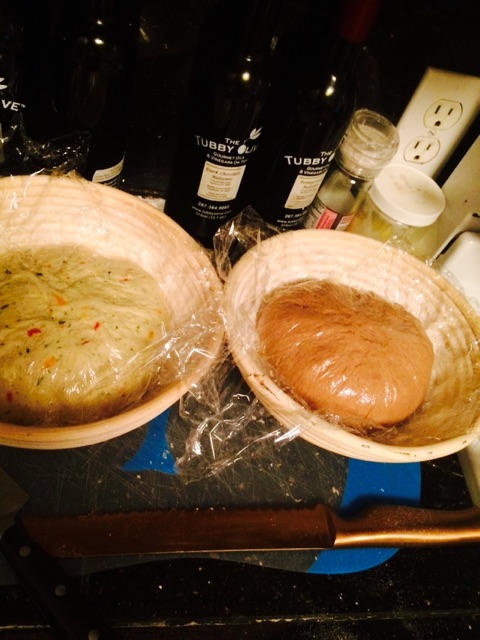 At this point, I was wondering whether it was going to end up like a big round brownie with the chocolate smell and color. The salt and the other 1.5 cups of flour went in (Gold Medal bread flour) with some kneading to incorporate the last of the flour. It took some extra flour to account for the oils and extra mass of the Nutella, and then I added a bit more flour just to be safe. It never felt quite like a good white, wet bread dough. The kneading that preceded some stretch and folds ensured a tight crumb later on, and the dough really stood up to gravity while proofing next to its buddy, a very different and spicy bread.