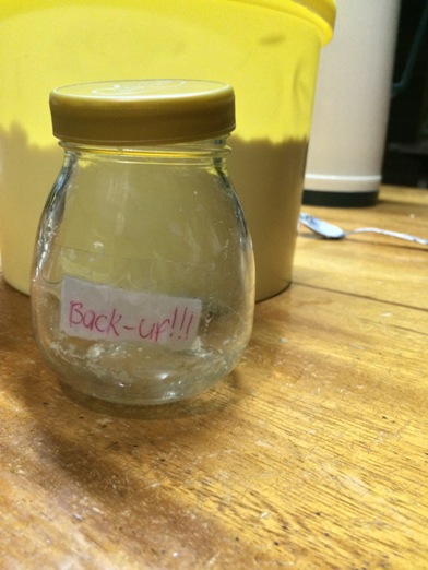 It ain't a new starter! It's still my old friend Zhou Clementine! I forgot I hid a part of her (Ain't it like horcruxes?! Okay, let's not associate her with those kinds of things! :P) at the back of the fridge near the freezer. I just saw it while looking for a drink, I tried my luck and fed it and Wooh! It tripled the next day. She is still alive. It turns out that my main starter was taken out of the fridge by my mom to make room for a food item mistaking it for just an ordinary jar, She returned it 5 days later that's why it died. Maybe I should label her home with a skull and crossbones next time to keep her away from those prying hands! XD