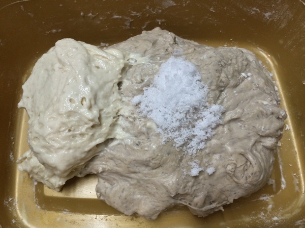 After the autolyze, I added the levain and salt and gave it 30 slap and folds. I gave it 2 more sets of 30 slap and folds each one hour apart. The dough became smooth and silky.