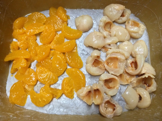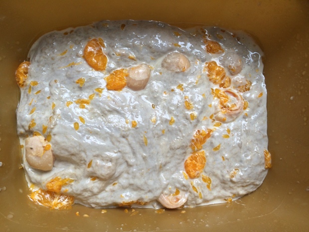Here is the dough the next morning. I used canned lychees and mandarins because fresh ones are not yet in season. I forgot how much water they contain and made the dough extremely watery, much like a ciabatta!