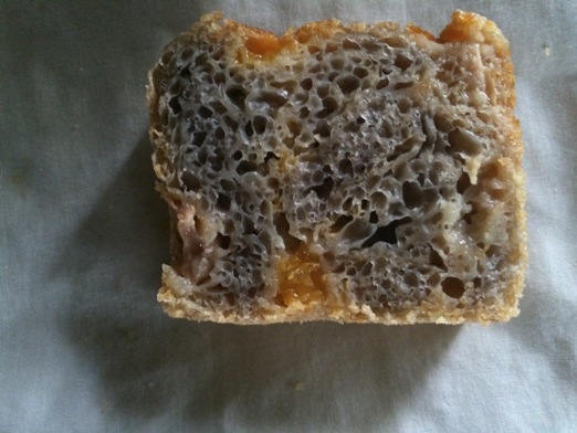 Whenever I see such crumb colours, I'm tempted to explore a swirl pattern in the dough, an example would be putting the oranges in one half and the lychee in the other and then stacking and rolling together (maybe twisting) or layering the slack dough in the pan.