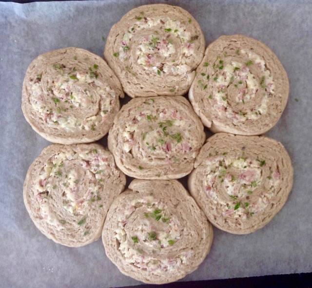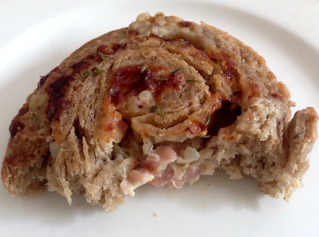 We loved the hearty rolls! The laminated rye layers came apart and had a satisfying crunch, and the filling was delicious. The pretty flower shape, though, prevented the crisping in those places where the rolls touched. Being a sucker for crispiness, I would sacrifice form for function next time, and bake the spirals separate from each other.