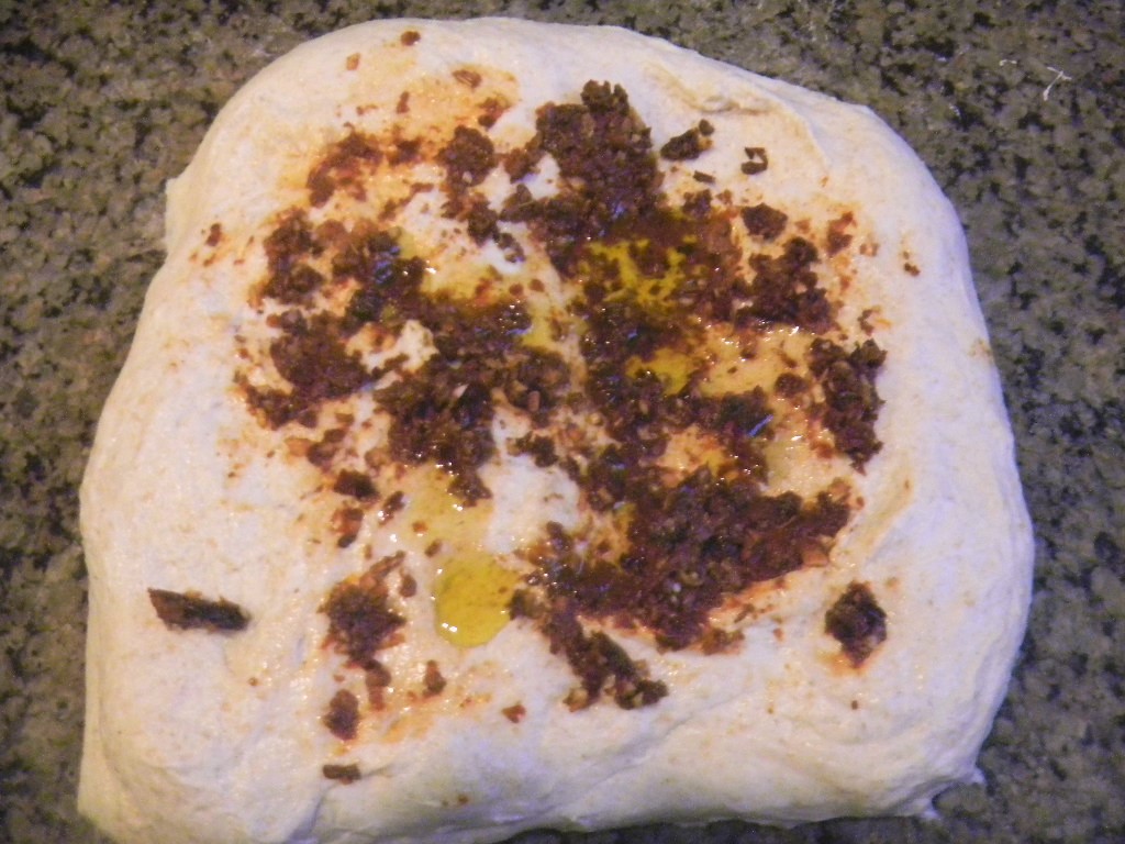 The whole grains for the YW dough flour totaled 19 % and the remaining dough flour was 50% Lafama AP and bread flour. The 1T rosemary, 2T sun dried tomato and 1 clove of garlic were to taste. It was a great dough to work with because it was 71% hydration overall. We used 2% pink Himalayan sea salt.