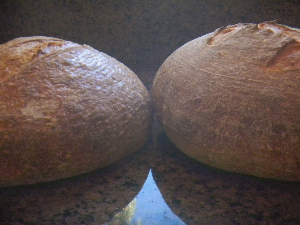 Here is a pix showing the height difference in the two breads. We shall see who wins the open crumb award. Glad you like the bread Ru and happy baking.