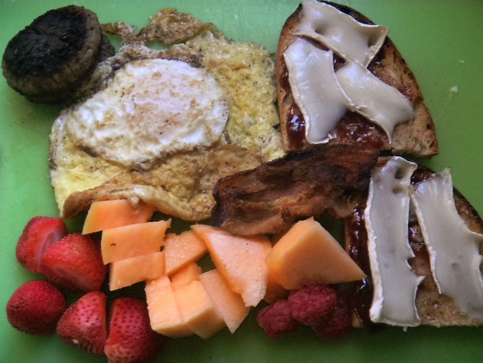My wife and I might have to have the same dinner as the girls. The SD bread toasted with butter, red raspberry jam, goat brie cheese and egg, sausage and thick apple wood smoked bacon made a fine breakfast sandwich.