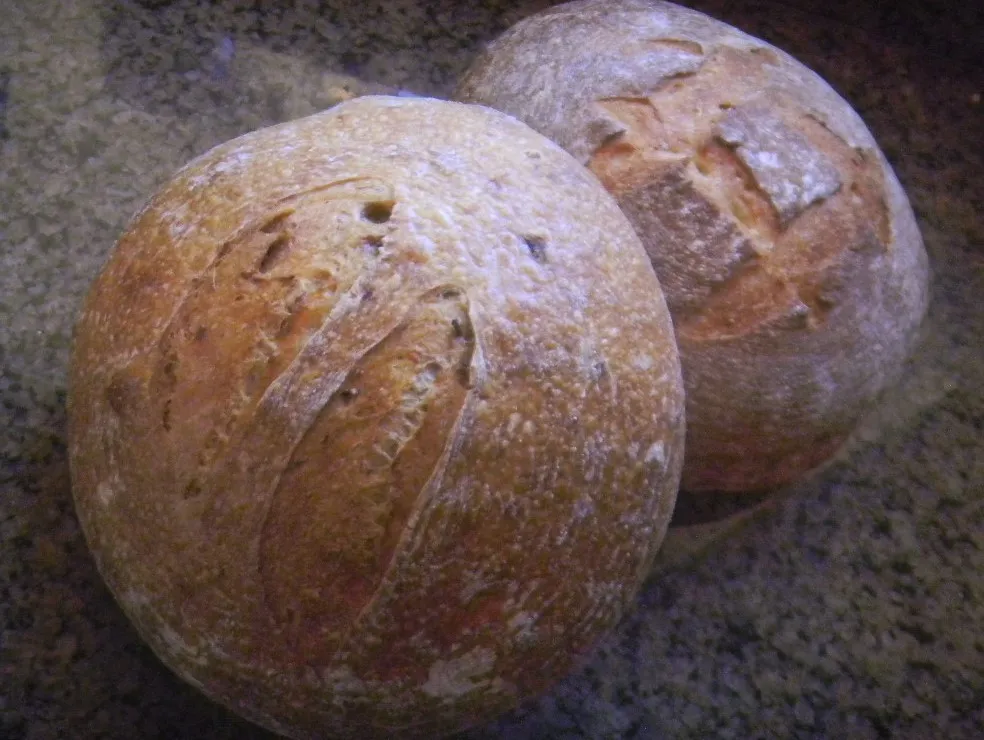 The SD bread was not retarded and placed into a rice floured basket for a counter proof. Both of the breads wee baked at the same time. The YW bread was baked in a DO and the SD bread was baked on a stone with Mega Lava Rock Steam so the oven had both baking methods going on at the same time – a first even for Lucy!