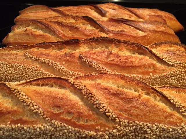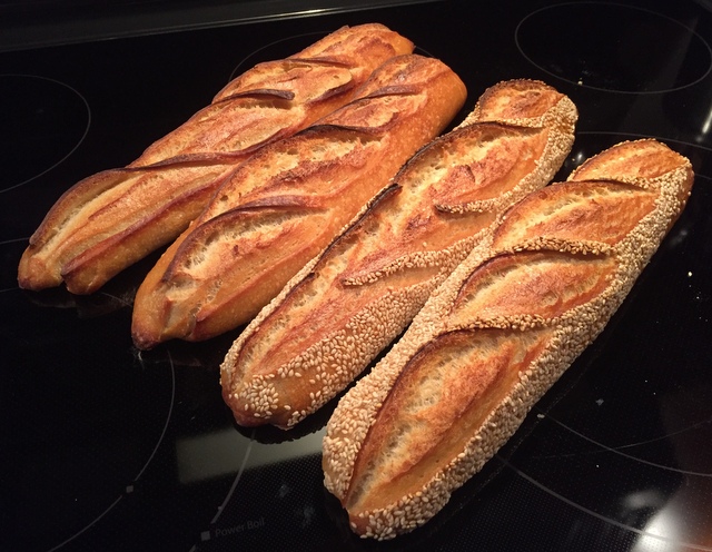 Not enough successful experience with durum baguette scoring in the very few times I made durum baguettes before.  Especially the seeded breads which have a tendency to fight getting a good bloom on a baguette.  Not so here.  I have to say that this is my best scoring of semolina/durum baguettes so far, although once more a few too close together score lines merged.