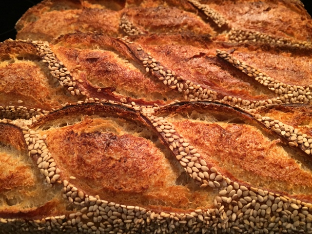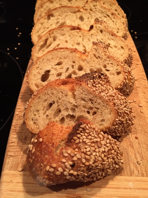 I can't wait for the flavor analysis! I though sesame seeds can get burnt when sprinkled on bread toasted. Have you tried to shape a Tartine country loaf into baguettes?