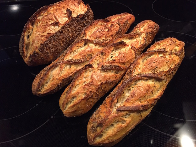 Hopefully a mistake not to be repeated. Working my way through a baguette, but when I get to the armadillo batard, it may well be a challenge to: 1) not be picking up errant and far flung caraway seeds from everywhere, and 2) deal with such a strong flavor all in one place.