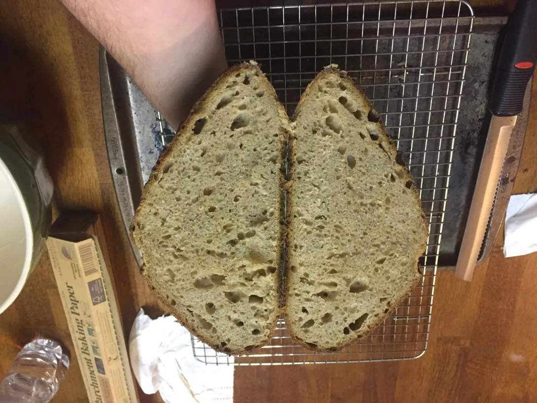 Around 9 the next morning I preheated the oven to 475 F with steam. When I went to remove the dough from the bowl, it stuck. There was quite a bit of stretching and it spread out when I put it on the baking sheet. I tried to score it but it just moved with the knife. Turned the oven down to 450 F and threw it in the oven for 20 minutes. Then turned the pan 180 degrees and set the oven to 425 F for 15 minutes. Turned the loaf 180 again and left it in the oven for another 15 minutes.