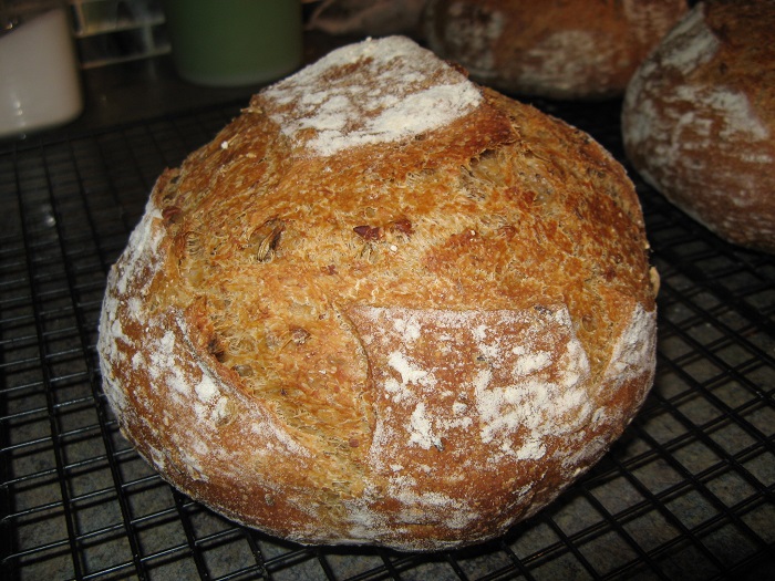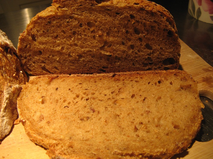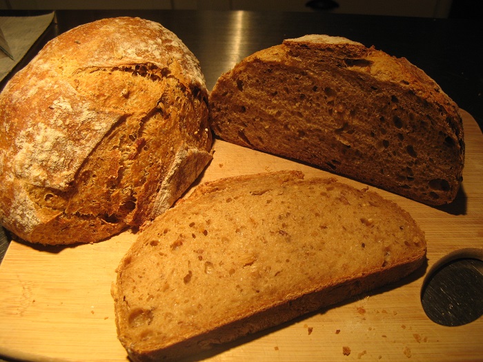 I was so happy with this bread. Even with all that stuff in it, it was not dense. The crust was amazing, and so was the crumb. The things that contributed were: