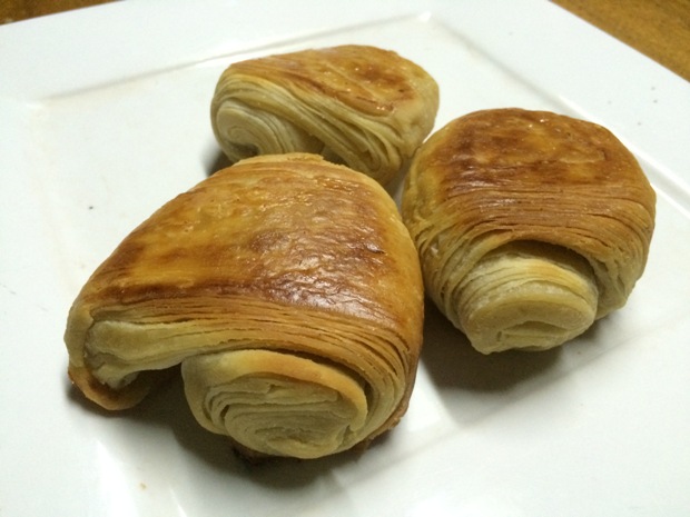 After another hour, I shaped them like pains au chocolat and proofed them for 4 hours before baking. The dough was resisting in the final roll-out so I was able to roll it only to a short length then divided into 3 so they were short and fat and do not look like sticks that much. :D Now this is where the slow levain becomes a problem, before 3 hours is enough for my breads to be fully proofed but it's already getting dark and I don't want to cook outside in the dark and cold.