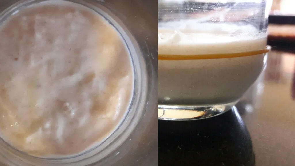 At the end of 12 hours the mound had spread out and there were very few bubbles around the sides. I just stired it down and heres what it looks like 18hrs after the feed. It still smells only like flour and water so I am sure its not hungry and starved.