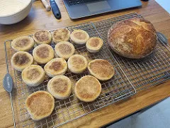 With the discard I decided on English muffins. It was kind of a hybrid recipe that I put together from various renditions posted on this site, and KA. Griddled them with bolted white corn meal. They definitely didn't get the nooks n' crannies - bummer! But overall, good flavor.
