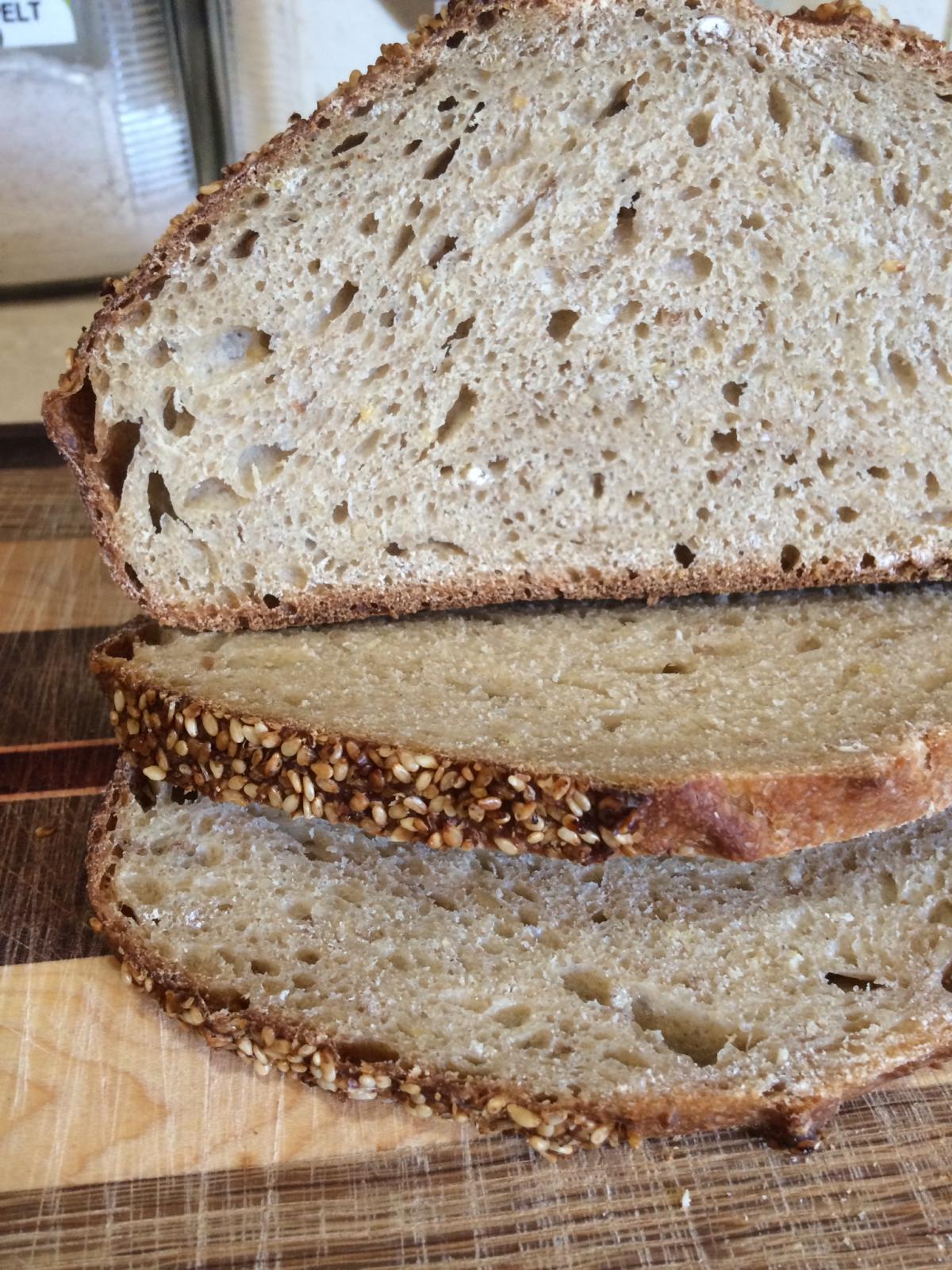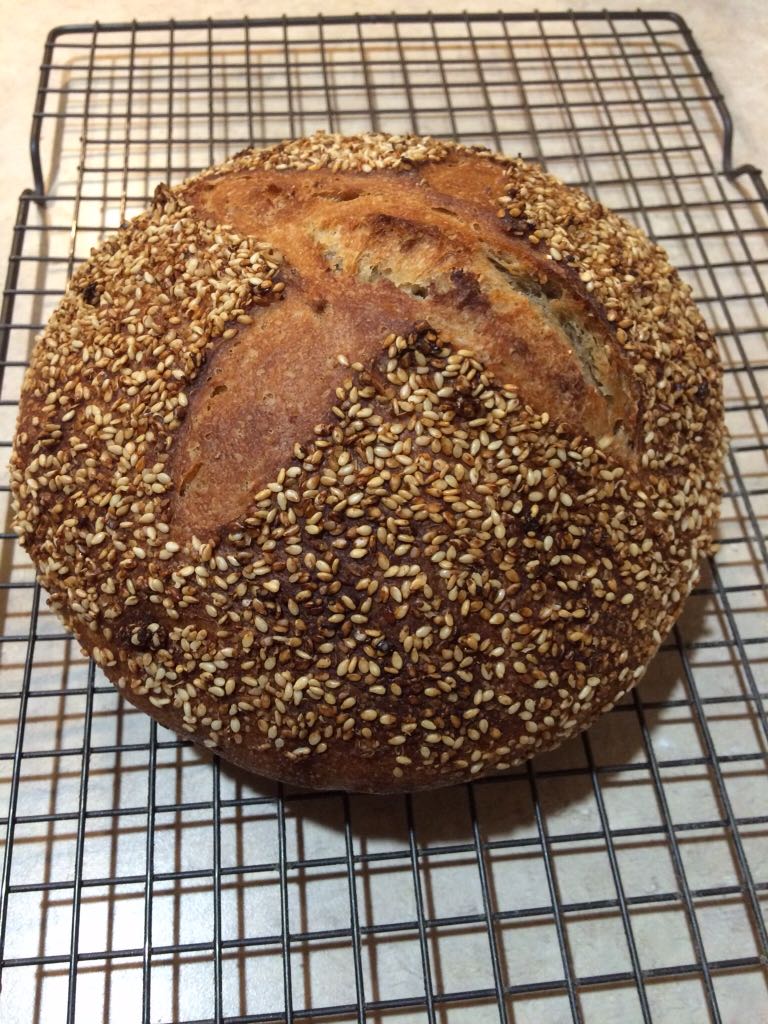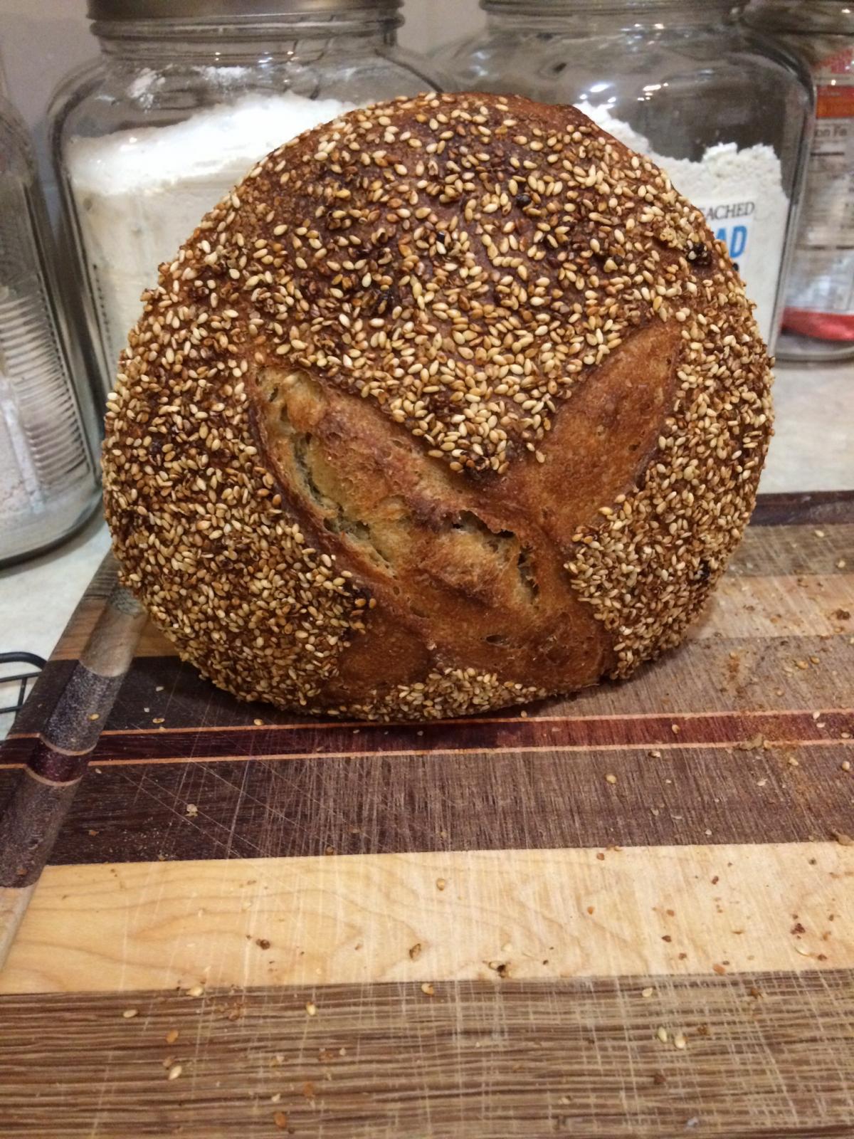 I was pleasantly surprised with the outcome of this loaf. It had good oven spring, and even a bit of BURST! Taste: Delicious, a pronounced wheaty flavor with no bitterness. Crumb: What I would call moderately open, moist, chewy, and slightly dense. Crust: Hearty, but not hard or tough, and extra tasty with all those sesame seeds. It's always nice when things turn out even better than you anticipate!
