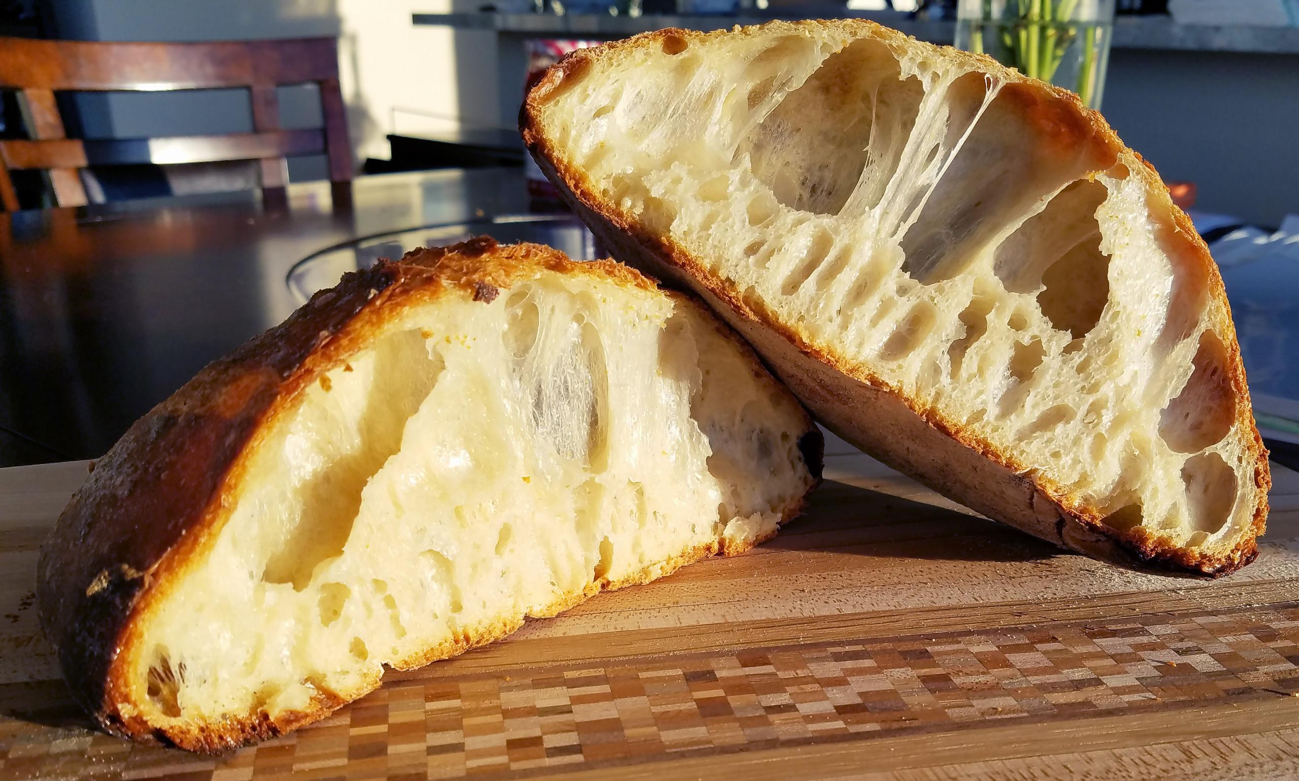 I'm actually going for the big holes here... My understanding of the "tartine style" is that we're looking for gigantic open holes in the crumb, so this is what I've been working toward via handling/hydration... it's just the overall shape of the loaf that I'd like to tweak.... though i realize this may not be doable at this hydration baking free form on a stone.