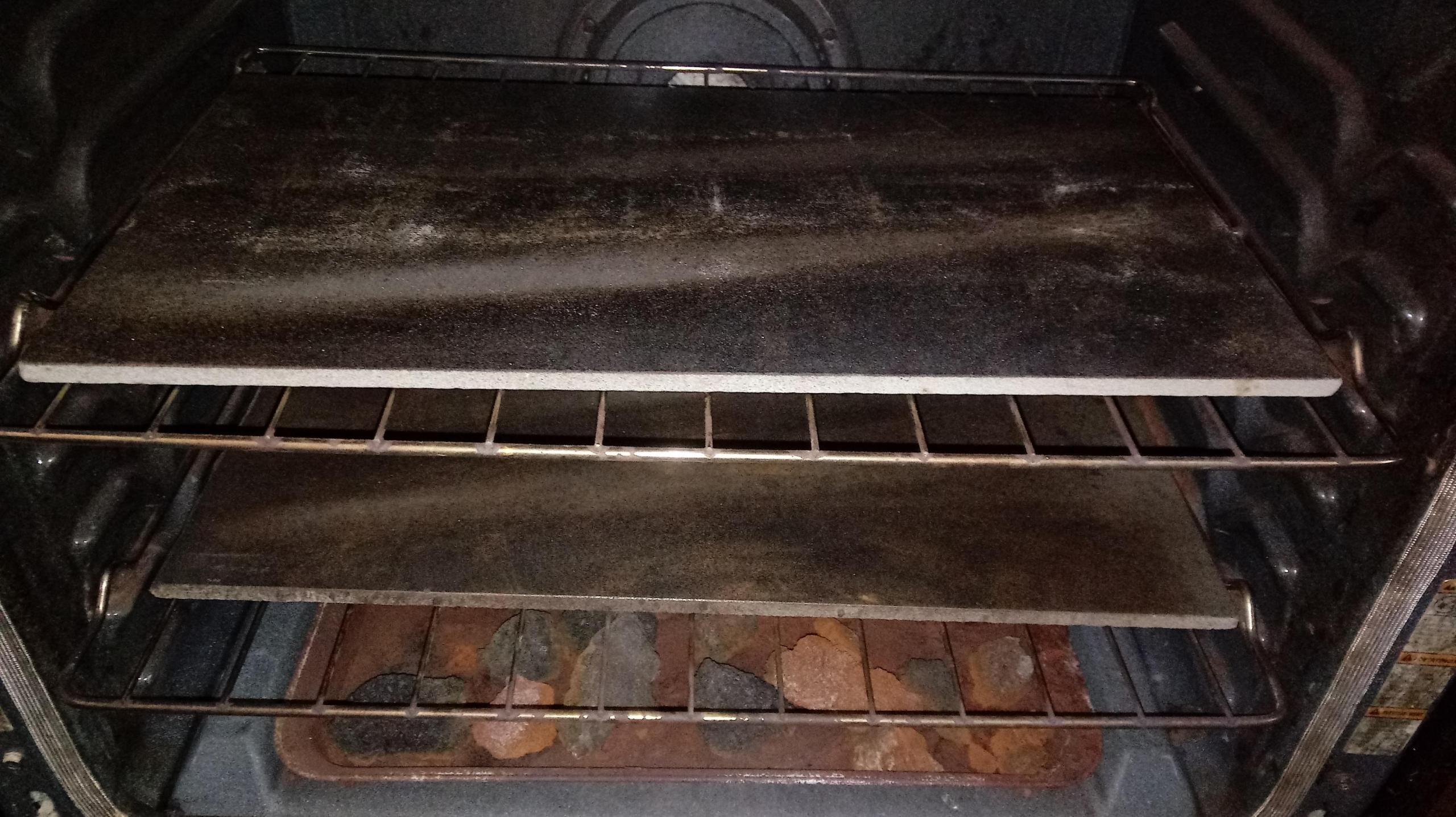 I don't really know the dynamics of differing stones, so I did some TFL queries before deciding on the granite deck. Thicker than I wanted, but the slenderest remnant they had the other day, and I liked the bright reflective quality of the stone's color. Cut to match the same dimensions as the clay tiles, it is sized exactly for the left and right outermost rungs on the oven shelf and from the back rung to the front rung. There apparently is plenty of room for the steam generators on the lower shelf to work their magic around the stone, just as they did with the tiles.