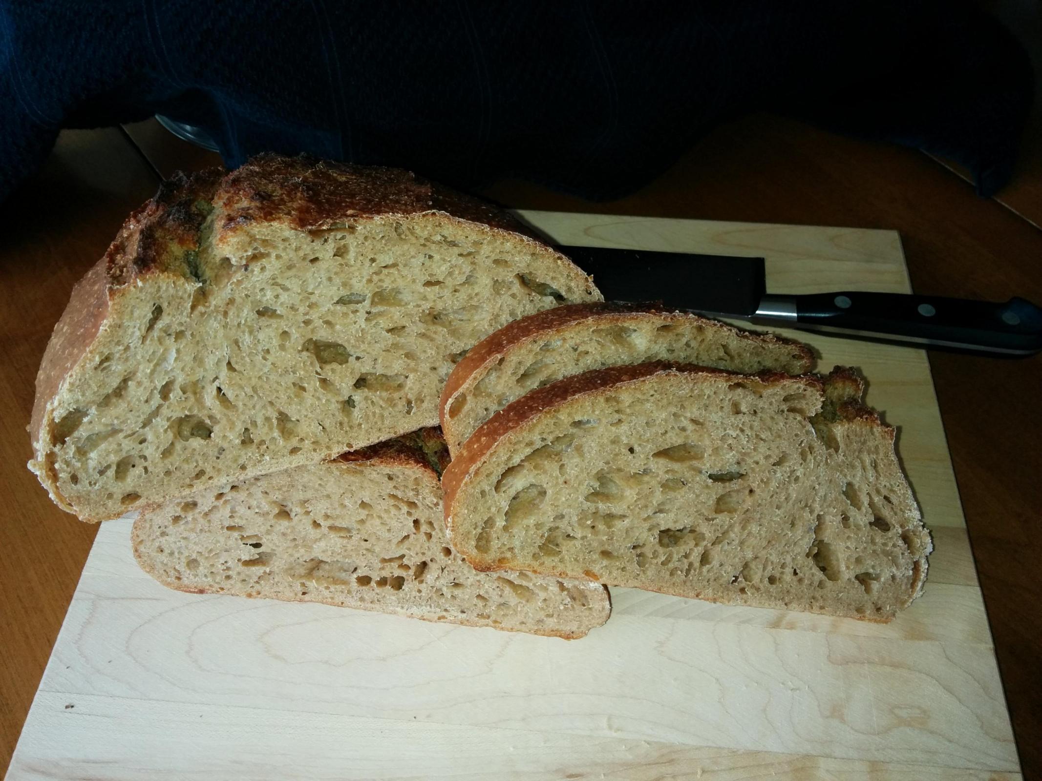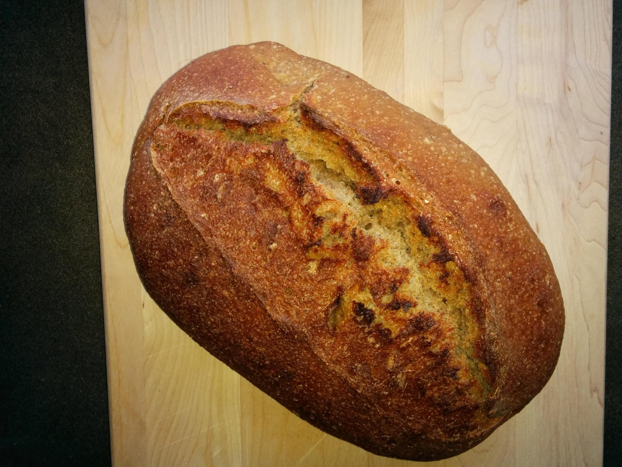 For my "base" bread for the week, I stuck with the 50% whole grain that I enjoyed from last week, but scaled down and with a different preferment percentage and timing. I haven't quite developed the feel for fermenting / proofing yet, so it was slightly under-proofed, and I didn't get as much caramelizing as I would have liked, but it's still just fine for our "base":