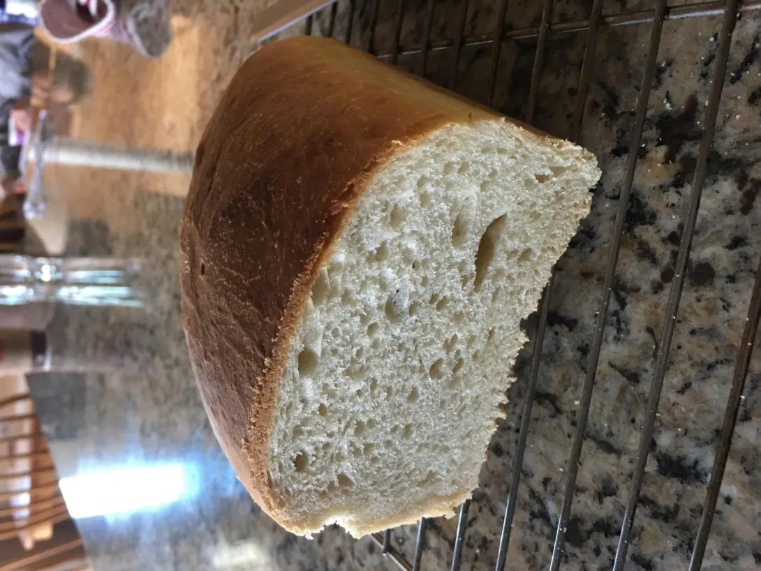 I made a loaf of white sandwich bread today (the recipe is from Rose Levy-Berenbaum's The Bread Bible). Overall it turned out pretty nicely, but I did notice a small area of denser crumb along the bottom/the bottom left-hand side of the loaf.