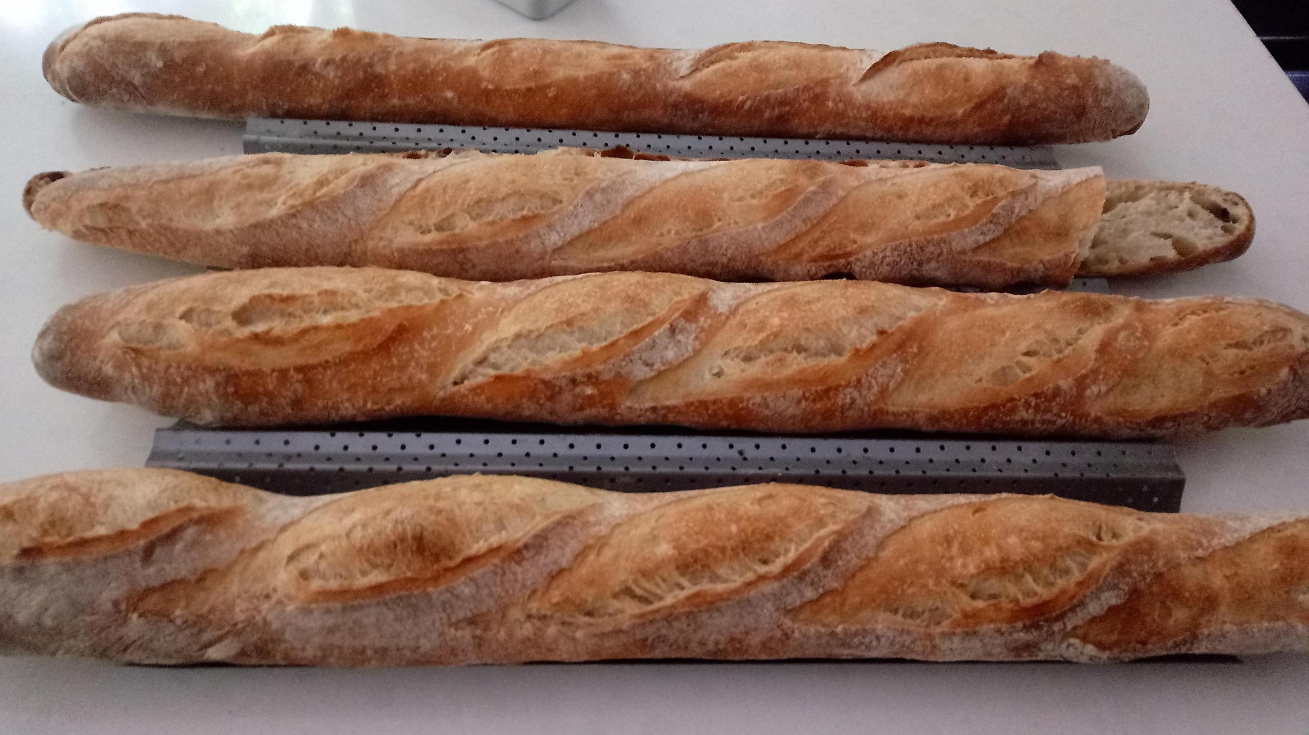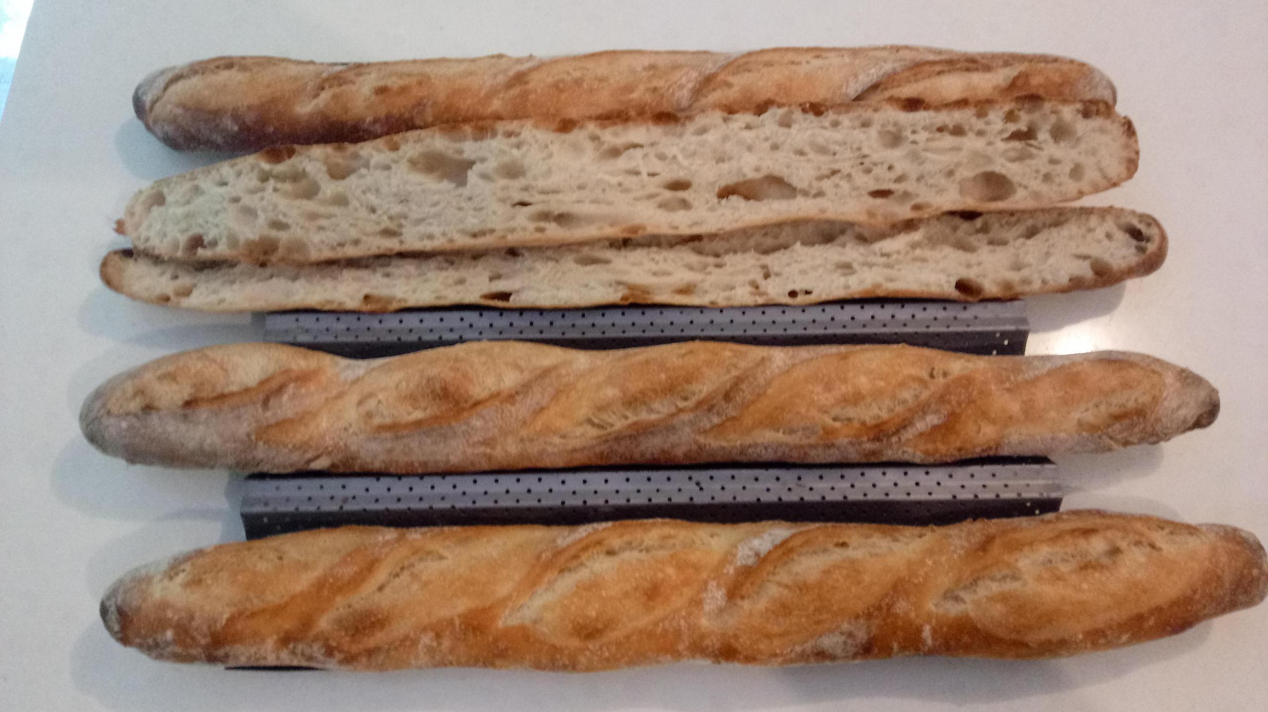 ...well really being nice to my wife to,show that I use them for something. As you probably know I have two basalt slabs (22"x12") and before I sourced these slabs she bought me this baguette tray. I immediately felt kind of bad because I knew I was not going to ever bake a loaf in them so I just use them for doing and actually they work quite well so after all I am glad its comes in useful. So yeah today I didn't end up trying the pattern change up and ended up just adding a little less steam on the second batch of two. I also decided to bake the second two a bit darker hoping for more Browning contrast but what I ended up with was all over darker loaves. I can't seem to figure out how you get so much contrast on your grignes. But then again I'm not really sure why I'm getting more consistent blooms these days so its,probably just experience. Will post today's bake soon - better crumb today, a little less success on spring but still pretty happy with it (oh an no seeds yet - maybe next bake)