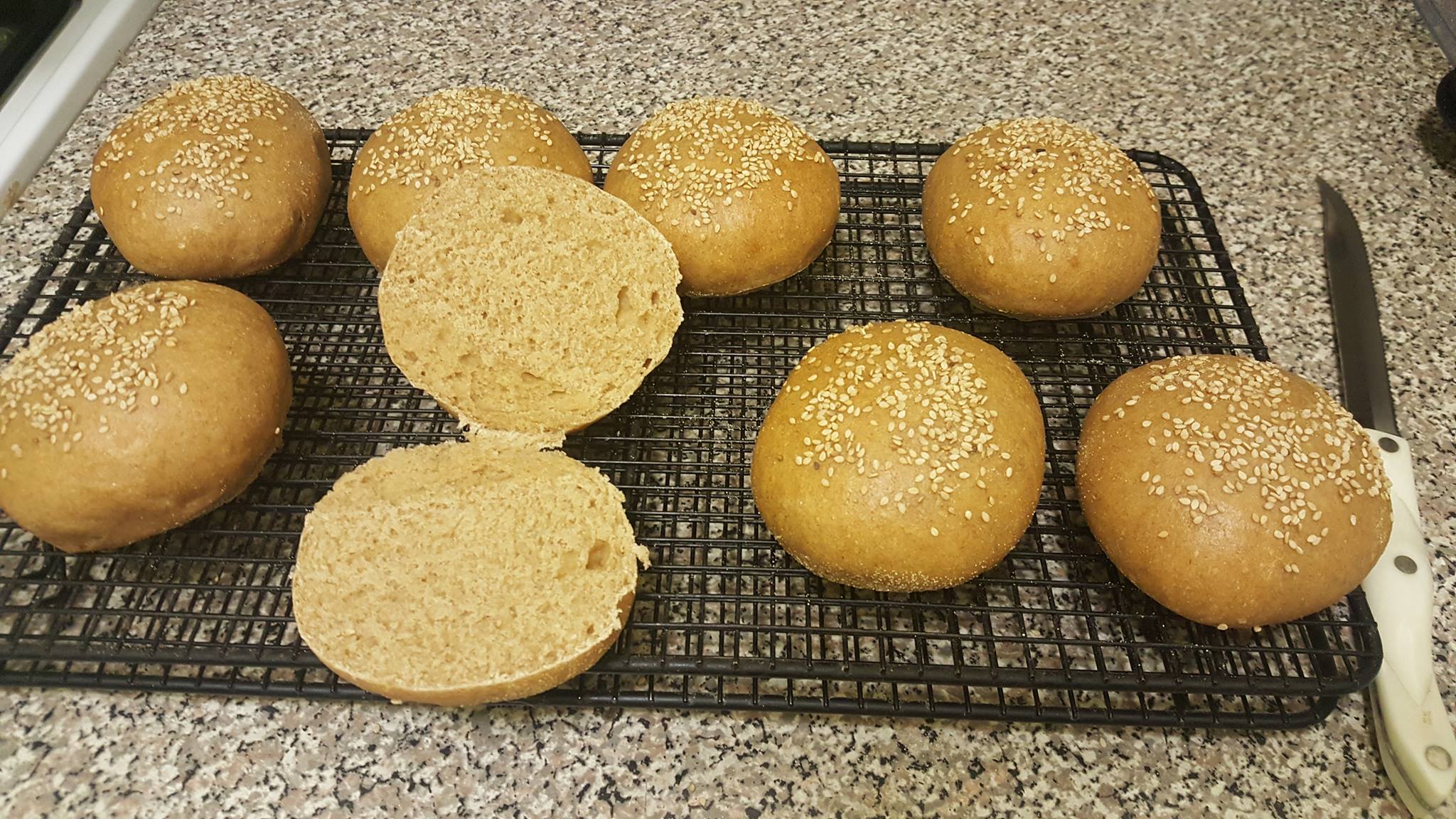 Well, I lived, I baked, I learned. W.W. is way harder than white flour! Still, not bad for my first bake in 7 years! I revisited the English muffins. Still need work on my cuts outs. Burger buns for this weekends brunch, spot on! 100% Whole wheat sour dough. I converted the recipe myself. the recipe to sour dough myself! So I guess it is now mine!