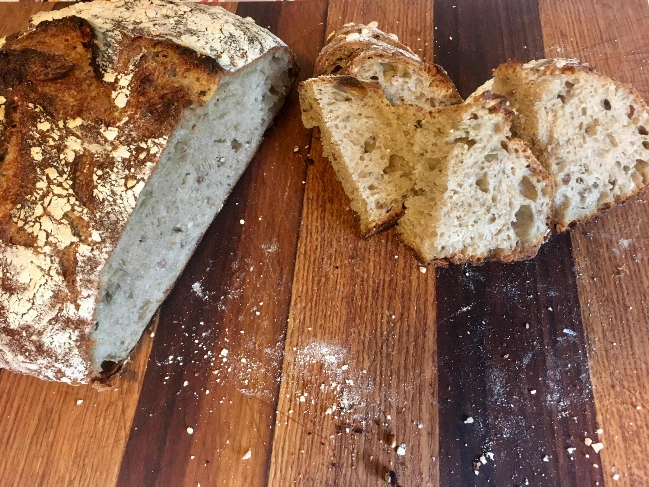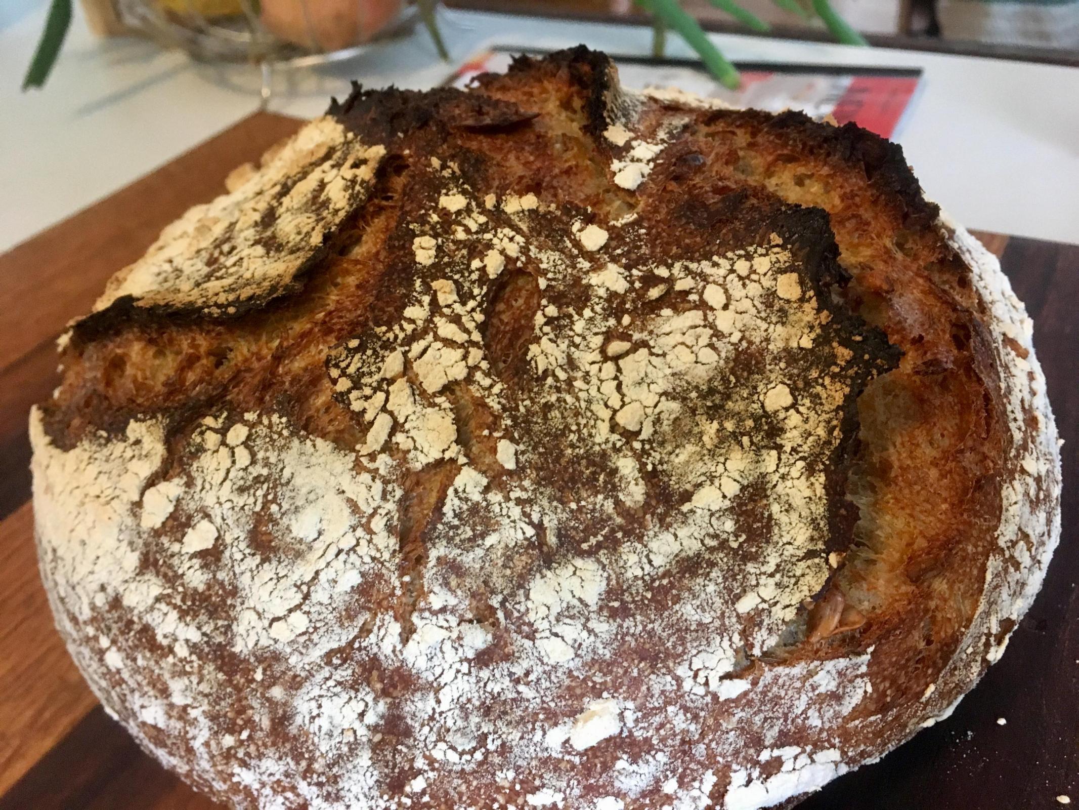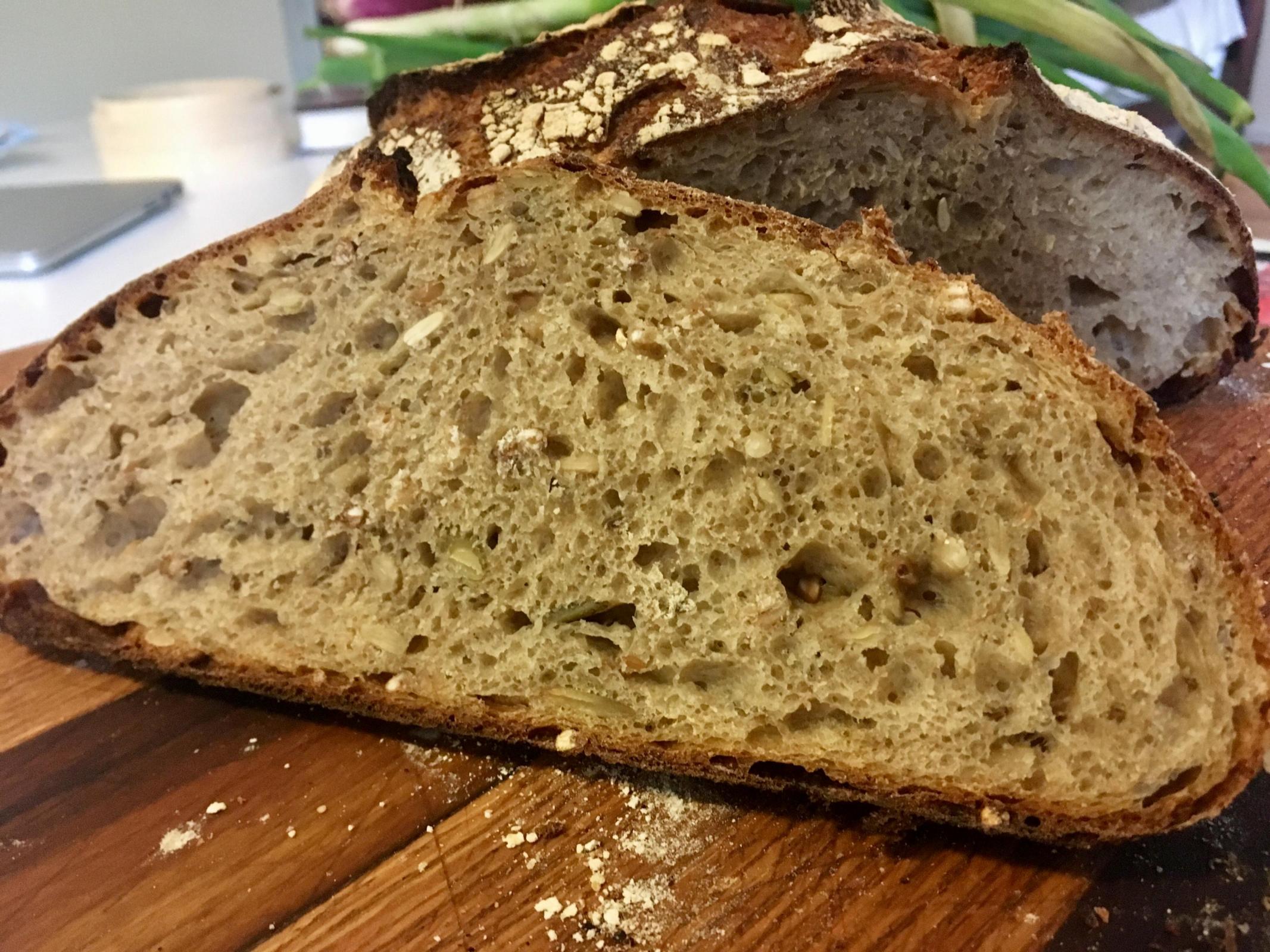 After overdoing it on plain baguettes, we've lately shifted towards Forkish-style multigrain boules for our daily bread. This one included a combination of bread, rye, and WW, along with a handful of seeds, including cumin and farro, which I think adds a pleasantly nutty taste. Our general approach is to autolyse the flour and water for at least 12 hrs in the fridge, then fold in the starter and salt, ferment on the counter until it starts to show signs of life, then retard in the fridge until we feel like it's time for bread (12-48 hrs). On bake day, I like to let the dough rise at room temperature until it doubles, then put in the banneton for a final rise. This loaf was baked in a dutch oven at some unknown, but pretty hot temperature; the oven suggested 500 F. We just moved apartments, and haven't had the chance to test the actual temperature of the oven, but it seems to run fairly hot.