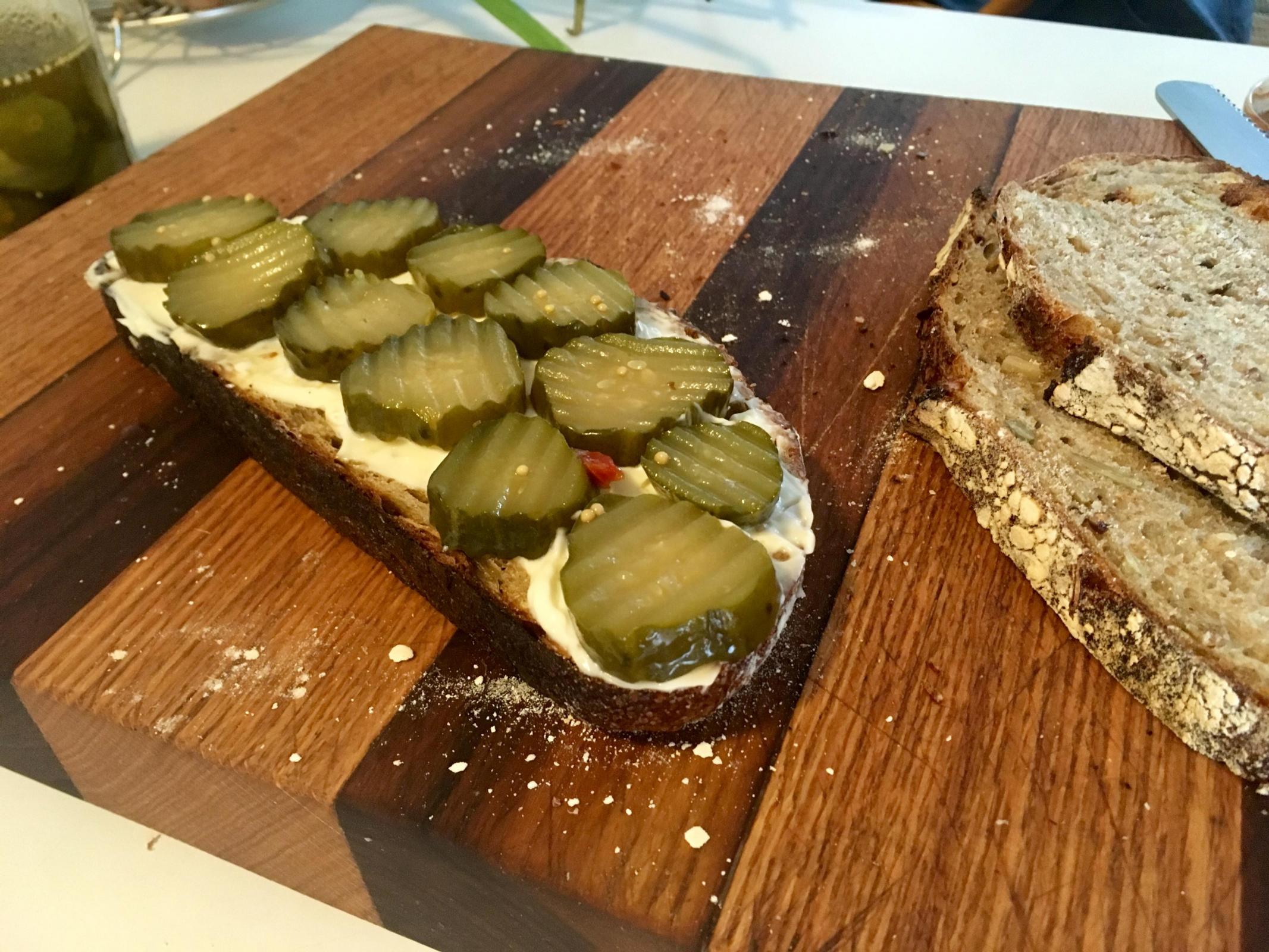 I know it was an acrylamide bomb, but this loaf was delicious! Nutty and earthy from the seeds (especially that cumin...), with a nicely chewy texture that was perfect for sandwiches. While it was wonderful with a slab of cultured butter and some fresh strawberry preserve (it's that time of year here in NC), I think it shined as the backbone of my favorite sandwich, the open-face pickle and mayo. Don't knock it 'til you try it!