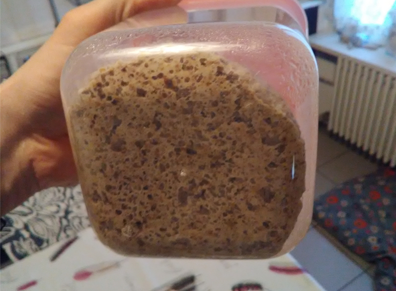 White flour ( 10 g proteins ) 50 g water 35 g bran 10 g, let it ferment to the heat until bubbles appear, usually 2/3 days are needed.