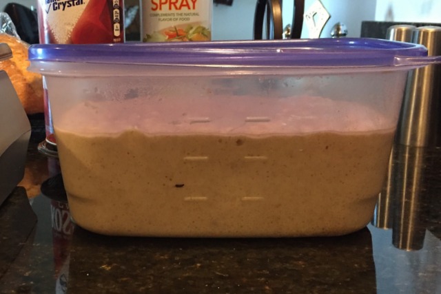The mixed flour poolish took about 11 hours to mature. In the picture the small black mark on the container was where the just mixed poolish started.
